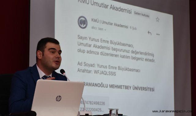 Arş. Gör. Yunus Emre Büyükbasmacı öğrencilerin hayal ettiği bölümü tanıması ve hedeflerine ulaşmalarında üniversite olarak onlara öncülük ve rehberlik etmeyi planladıklarını belirterek, projenin işleyiş süreci hakkında ayrıntılı bilgi verdi. Büyükbasmacı, seminerinin son bölümünde 'KMÜ-Umutlar Akademisi Yönetim Sistemi'ni katılımcılara anlattı.