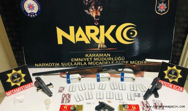 Karaman İl Emniyet Müdürlüğü Narkotik Suçlarla Mücadele Şubesi ekipleri uyuşturucu ile mücadele çalışmaları kapsamında uyuşturucu ticareti yaptığı ileri sürülen Ö.F.B, L.A, A.T. ve H.A.D. isimli 4 şahsı gözaltına aldı. Ekipler yaptıkları arama çalışmalarında 185 adet sentetik ecza maddesi, 0.40 g metamfetamin, 1 av tüfeği, 3 tabanca ve 103 adet fişek ele geçirdi. Emniyetteki işlemleri tamamlanan şahıslar adliyeye sevk edildi.Şahıslardan Ö.F.B, A.T. ve H.A.D. çıkarıldıkları mahkemece adli kontrol şartıyla serbest bırakılırken L.A. tutuklanarak cezaevine gönderildi.