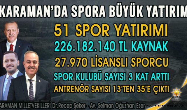 AK Parti iktidara geldiğinden bu güne Karaman’a 51 spor yatırımı yapılmıştır. Bu yatırımlardan 42 tanesini tamamlanmıştır. 5 yatırımın yapımı devam etmektedir. 2 yatırım sözleşmesi imzalandı yapım aşamasındadır. 2 yatırım ise ihale aşamasındadır.
