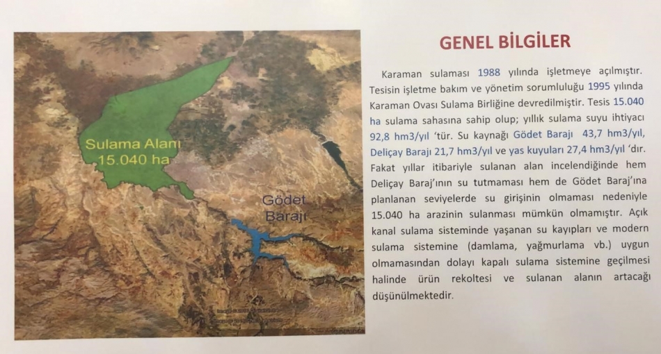 Üreticilerimizin 30 senedir özlemle beklediği tarihi proje olan Gödet Barajı sulama amacıyla 1983-1988 yılları arasında inşaa edilmiştir. Kapalı sulama sistemi İhale izni alınabilmesi için ödeneğinin ayrılması gerekmektedir. Kapalı sulama sistemine geçildiği takdirde sulama kapasitesinin iki katına çıkması beklenirken, bu da Karaman tarımını ve çiftçisini direk etkileyip, tarıma dayalı sanayimize de katkı sağlayacaktır.