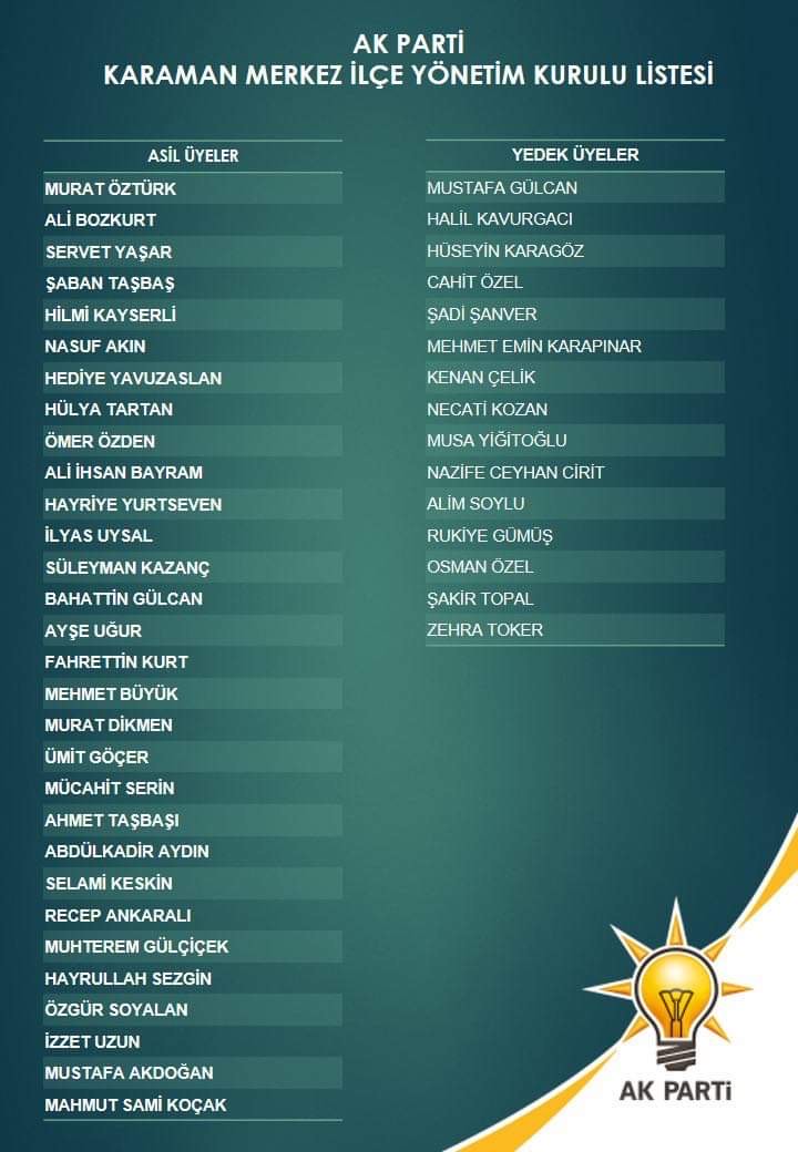 Geçen ay ak parti karaman Merkez İlçe Başkanlığına atanan Av. Murat Öztürk Yönetim listesini hazırlama sürecinde Vekiller İl Başkanı ve teşkilat üyeleri ile istişare yaparak yeni liste oluşturdu.