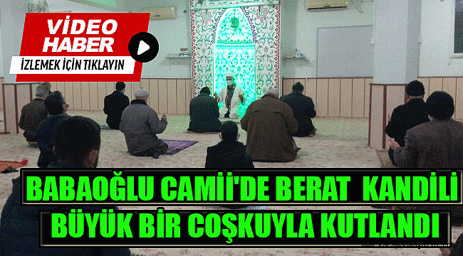 Ramazan ayının müjdecisi ve Şaban ayının on beşinci gecesi olan Berat Kandili İlimiz camilerinde coşkuyla kutlandı.Ellerini semaya, gönlünü Mevla'ya açan, günahlardan olabildiğince kaçan bütün Müslümanlar camilerde Berat kandilini ibadetle geçirdiler. dualar edip Cenab-ı Allah'tan af ve mağfiret dilediler.Babaoğlu Camisi'nde düzenlenen programda, çok sayıda vatandaş camiye gelerek dua etti. Programda vatandaşlar dua ederek namaz kıldı. Namazın ardından salavat getirildi. okuan hatim duasından sonra program sona erdi “