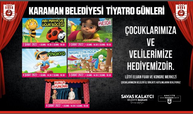 Karaman Belediye Başkanı Savaş Kalaycı, yarıyıl tatiline giren öğrencileri unutmadı. karaman Belediyesi tarafından 2-6 Şubat tarihleri arasında çocukları tiyatro ile buluşturmak amacıyla beş farklı oyun sahnelenecek. Lütfi Elvan Fuar ve Kongre Merkezi’nde düzenlenen tiyatro günleri, 2 Şubat Çarşamba günü Arı Maya ve Uğur Böceği oyunu ile başlayacak. Saat 14.30 ve 18.30 olarak iki seans halinde gösterimi yapılacak olan tiyatro gösterilerine çocuklarla birlikte velilerde davet edildi.
