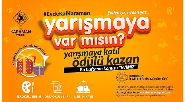 Koronavirüs (Covid-19) salgınını önleme mücadelesine katkıda bulunmak amacıyla karaman İl Milli Eğitim Müdürlüğü tarafından “Evde Kal Karaman” isimli Karaman genelinde öğrencilere ödüllü resim, şiir ve hikâye yarışması başlatıldı.