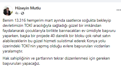 Karaman'ın sevilen ve başarılı avukatlarından hüseyin mutlu Sosyal medya hesabından yaptığı açıklamada ''Benim 13.316 hemşerim mart ayında saatlerce soğukta bekleyip devletimizin TOKİ aracılığıyla sağladığı güzel bir imkândan faydalanarak çocuklarıyla birlikte barınacakları ev ümidiyle başvuru yaparken, başka bir projede 40 dairelik bir bloku çok rahat satın alabileceklerin bu güzel hizmeti suiistimal ederek Konya yolu üzerindeki TOKİ’nin yapmış olduğu evlere başvuruları vicdanları yaralamıştır.