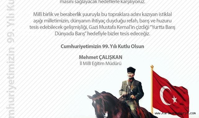 İl Milli Eğitim Müdürü Mehmet Çalışkan Cumhuriyetin 99. yılı sebebiyle bir mesaj yayımladı. Mesajında İl Müdürü Mehmet Çalışkan şu ifadelere yer verdi: