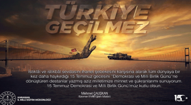 İl Milli Eğitim Müdürü Mehmet Çalışkan, 15 Temmuz Demokrasi ve Milli Birlik Günü sebebiyle bir mesaj yayımladı. İl Müdürü Çalışkan mesajında şu ifadelere yer verdi: