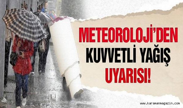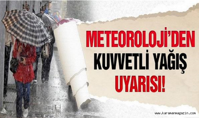 Kuvvetli Yağışlara Dikkat!Yarın (Perşembe) öğle saatlerinden itibaren Konya’nın güney kesimleri (Ahırlı, Yalıhüyük, Akören, Seydişehir, Derebucak, Bozkır, Hadim, Taşkent, Güneysınır, Ereğli, Halkapınar) ile Karaman il geneli ve Niğde (Bor, Ulukışla, Çamardı) çevrelerinde etkili olması beklenen yağışların, yer yer kuvvetli olmak üzere yağmur ve sağanak yağmur; rakımı 1500m’nin üzerinde olan yerlerde kar şeklinde gerçekleşeceği beklenmektedir. Kuvvetli yağışın sebep olabileceği sel, su baskını, yağış anında kuvvetli rüzgâr, yüksek kesimlerde buzlanma ve don olayları ile ulaşımda aksamalar gibi olumsuzluklara karşı dikkatli ve tedbirli olunmalıdır.