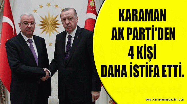 Alınan son dakika bilgisine göre 4 kişinin daha görevlerinden istifa ettiği bildirildi. Merkez İlçe Yönetiminde görevli Abdullah Yeni, Abdullah Recep Koca, Mustafa Küçükbasmacı ve İl Yönetiminden adının geçmesini istemeyen bir kişinin istifa ettiği öğrenildi.ABİDİN ÇAĞLAYAN ANKARAYA'A ÇAĞRILDIDün Bakan Lütfi Elvan'ın da katıldığı AK Parti Mersin İl Kongresine katılmak için Mersin'de olan Karaman AK Parti İl Başkanı Abidin Çağlayan'ın Ankaraya çağrıldığı bilgisi haber merkezlerine ulaştı. İstifalarla ilgili şu ana kadar bir açıklama yapmayan Başkan Çağlayan'ın Ankara dönüşü bir açıklama yapması bekleniyor.