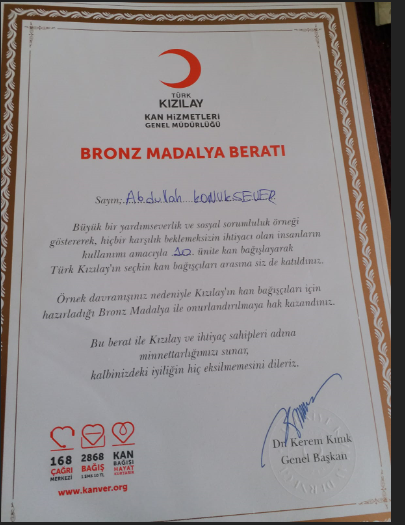 Yaşı 65, Türk Kızılay'ına kan bağışında bulunan ve bronz madalya ve teşekkür beratı ile ödüllendirilen Konuksever, "Kan bağışlamak insanı gençleştiriyor, hayata bağlıyor. Herkesi kan bağışçısı olmaya davet ediyorum" diye konuştu.Karaman’da yaşayan abdullah konuksever 10 defa kan bağışında bulundu..