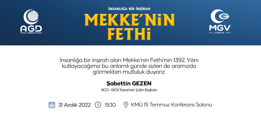 Anadolu Gençlik Derneği Karaman Şubesi, geleneksel programlarından birini daha gerçekleştiriyor. Mekke’nin Fethi’nin 1392. yıl dönümünün kutlanacağı programda İlahiyatçı-Eğitimci Mustafa Kayhan Hoca, Mekke’nin Fethi’nin anlam ve önemine değinecek. Programda ayrıca Hafız Osman Akyol’dan Kur’an tilaveti, sinevizyon gösterileri ve Ezan dinletisi yer alacak. Siyer-i Nebi Yarışması Ödül Töreninin de gerçekleştirileceği fetih programında sevilen sanatçı Ammar Acarlıoğlu ezgileriyle gönüllerin pasını silecek. 31 Aralık Cumartesi günü saat 19.30’da başlayacak olan program Karamanoğlu Mehmetbey Üniversitesi 15 Temmuz Konferans Salonunda yapılacak.
