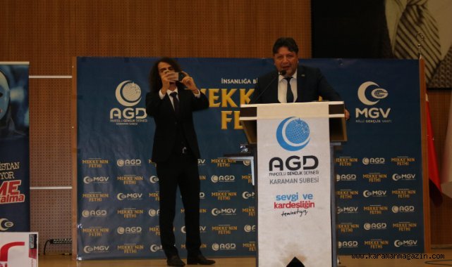 Anadolu Gençlik Derneği Mekke’nin Fethi’nin 1392. yıldönümünü kutladı. KMÜ 15 Temmuz Konferans Salonunda düzenlenen program, İstiklâl Marşının okunması ile başladı. Açılış Kur’an-ı Kerim’inin ardından agd karaman Şube Başkanı Şabettin Gezen bir selamlama konuşması yaptı. Şabettin Gezen “Siz değerli misafirlerimizin bu gece burada bizimle bulunuyor oluşu bir kimliğin en güzel şekilde ortaya konulmasıdır. Hepinize katılımınızdan ve duyarlılığınızdan ötürü teşekkür ediyoruz.” diyerek Anadolu Gençlik Derneği’nin faaliyetlerini anlattı. “Biz tüm içtenliğimizle inanıyoruz ki Anadolu Gençlik Derneği, dünyaya yeniden yön verecek gençlik kadrolarının harmanlandığı yerdir.” diyen Şabettin Gezen katılımlarından ötürü misafirlere teşekkür ederek konuşmasını bitirdi.