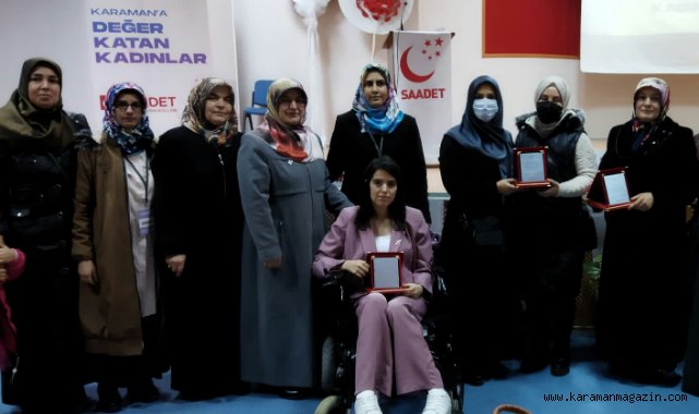 Saadet Partisi Karaman Kadın Kolları Yunus Emre konferans salonunda "Karaman'a Değer Katan Kadınlar" isimli bir program gerçekleştirdi. İstiklal marşının okunmasıyla başlayan program Kadın Kolları Başkanı Havva ŞAHİN' in açılış konuşmasıyla devam etti. Üç kategoride ödül verilen programda ödül sahipleri şu şekilde oluştu.