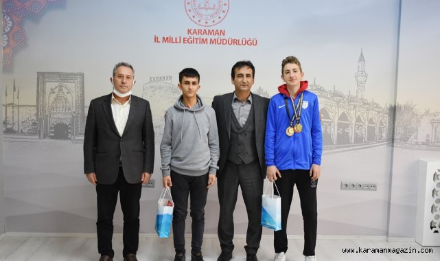Bursa’da düzenlenen Türkiye U16 Salon Atletizm Şampiyonası’nda altın madalyanın sahibi olan ve Karaman’ı gururlandıran Görkem Arıkan ile İstanbul’da düzenlenen TOHM Sporcuları Salon Atletizm Türkiye Şampiyonasında 60 m. engel branşında Türkiye 2’ncisi olarak gümüş madalya kazanan Mehmet Furkan Yıldız Okul, Müdürü Muzaffer Aydın ile birlikte İl Millî Eğitim Müdürü Mehmet Çalışkan’ı ziyaret etti.