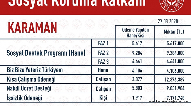 Sosyal Koruma Kalkanı Kapsamında KARAMAN ilinde vatandaşlara yapılan destek 52.228.041 TL ye ulaştı.