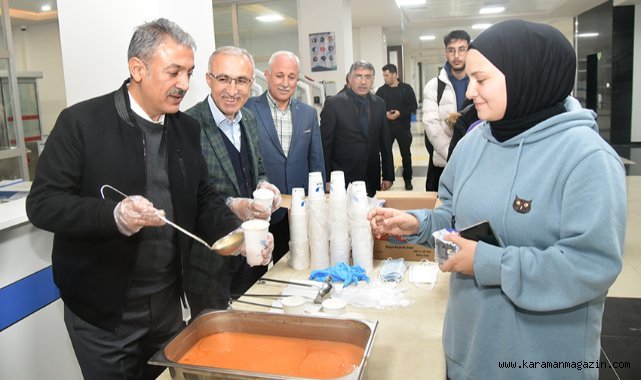 Öğrencilere nasihatlerde bulunarak moral veren Karaman Valisi Tuncay Akkoyun ve Rektör V. Prof. Dr. Hüseyin Karaman, daha sonra gençlere kendi elleriyle çorba ikram etti. Sınav hazırlıklarına kısa bir çorba molası veren öğrenciler ise ziyaretten ve KMÜ’de geleneksel hale gelen uygulamadan duydukları memnuniyeti dile getirdi.